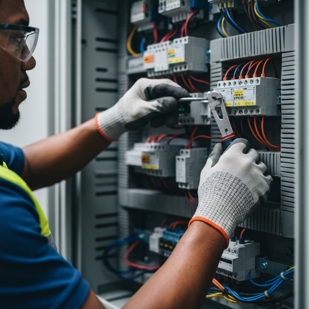 Heavy-duty installations, motor circuits, control panels, machinery wiring, factory lighting, power distribution, and industrial electrical maintenance.